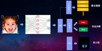 目前深度伪造视频图像的检测方法研究者主要提出了基于视频图像本身成像特征分析的方法和基于数据驱动的深度学习分析方法两类。基于视频图像本身成像特征的检测方法主要包括通过分析视频图像中的光照不连续性、阴影不连续性或几何位置不一致等图像的物理特征来辨别图像的真实性。还有提出通过分析视频图像成像设备传感器噪声差异性特征、色差差异性特征来判别图像真实性的方法,还有提出通过分析查找视频图像的压缩痕迹(DCT系数、块状效应等)特征或图像重采样特征以发现视频图像伪造的痕迹,还有研究者提出利用人的生理信号特征如眨眼频率、脉搏、心率等的不协调性和不一致性检测判别视频图像的真伪。基于这类特征的检测方法大多只能检测特定伪造类型“痕迹”,肉眼容易识别的篡改,检测结果的可解释性比较好。随着深度学习技术的发展,研究人员也提出基于数据驱动的深度学习检测方法。有研究者提出利用对比损失函数,在大量的虚假与真实图像数据上进行训练,从而学习到有效区分真假图像特征表示,达到分析识别真假图像的目的。也有通过分析和提取真伪图像自身差异化特征,进而训练分类器实现深度伪造图像的检测,还有应用各种卷积神经网络、循环神经网络和胶囊网络等深度神经网络结构的视频图像真伪检测方法。由于深度伪造技术主要基于生成对抗网络,所以,研究者也广泛关注生成对抗网络产生的图像在色彩分布上是否有别于自然图像,提出基于各种颜色特征进行检测识别的方法,也有提出寻求不同GAN网络在生成视频图像时留下的网络指纹特征作为分类识别的依据,用于识别和溯源不同的伪造方法。此类基于GAN指纹特征的方法会依赖GAN的结构,随着GAN技术迅速发展,基于GAN指纹的方法所提取的GAN指纹特征并不具有持久性和通用性,方法的泛化能力不足。针对深度伪造视频,目前的检测方法仍聚焦于“换脸”技术检测。由于视频在被压缩后,帧数据会产生严重的退化现象且视频帧组之间的时序特征存在一定的变化,故多数基于静态特征的深度伪造图像检测方法无法直接用于深度伪造视频的检测。由于深度伪造模型经常使用静态的面部图像集进行训练,生成模型对人脸先验知识建模不足,难以实现对眨眼、呼吸和心跳等生理信息的准确伪造。因此,很多研究者提出各种基于生理信息的合理性来构建深度伪造视频检测的方法,比如利用不自然的眨眼动作、不一致的面部和头部的朝向、面部区域的视觉伪影等特征实现视频真伪检测。还有研究者关注到伪造生成的视频在时空域上很难做到人脸、皮肤在不同光照和相机视角下的完美融合,提出基于视频帧间不一致性、光响应非均匀性(PRNU)模式差异 、帧间光流的不连续性、面部和周边区域的分辨率不一致等伪造特征痕迹的检测方法。随着人工智能技术的应用,音频合成和转换能力不断提升,生成的音频越发逼真,单凭人的听觉判断已经难以主观分辨,因此,研究针对恶意使用的音频深度伪造检测识别方法变得就愈发重要。目前,深度伪造音频的检测识别主要通过基于音频信号分析的方法和基于语速、声纹和频谱分布等生物信息特征的深度学习方法两类。音频真伪的检测识别研究起初主要基于音频信号处理的思路,研究者有提出对频谱特征建模,使用常量Q倒谱系数(constant-Q cepstral coefficients) 、归一化余弦相位和修正的群延迟等方法进行检测识别,这类方法对采用特定音频处理技术的音频识别效果较好,但方法的泛化性能不佳。随着深度学习技术的发展,基于数据驱动的深度学习检测方法逐渐被研究者所关注。Gomez-Alanis等人通过融合轻量级卷积神经网络和循环神经网络, 提出一种由光卷积门控递归神经网络提取伪造音频深度特征的检测方法。Li 等人提出融合梅尔频率倒谱系数(Mel frequency cepstrum coefficient)、常量Q倒谱系数(Constant Q cepstral coefficient)和FBank 等多种声学特征的多任务学习检测思路。Monteiro等人提出将声音表征为视觉的频谱图,利用时间卷积网络对频谱图的清晰度进行识别分析以判断音频是否伪造。伪造语音的检测从传统信号处理方法发展到深度学习方法,在应对语音欺骗领域取得了一定的成果,但是现有方法还是依赖特定攻击类型,对未知类型攻击检测的泛化性提升还有很大的空间。总之,随着人工智能的技术发展与应用深入,深度伪造检测技术在保护个人隐私、维护公共安全、促进司法公正等方面越来越显示其重要性,应当引起社会各界的充分重视。