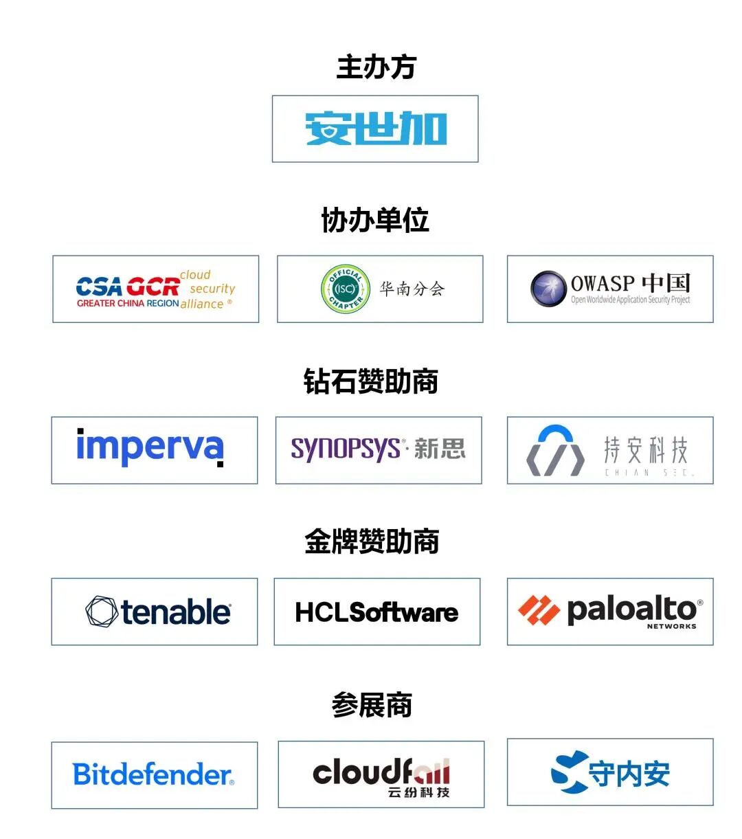 本次峰会的协办单位是 OWASP、(ISC)² 华南分会、云安全联盟,赞助商是 Imperva、Synopsys、持安科技、Tenable、HCL、Paloalto Networks、Bitdefender、云纷科技、守内安。