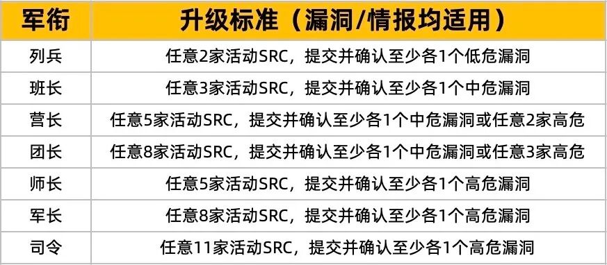 司令称号只授予第一个到达军衔要求的白帽战士,12家SRC的安全高管将联合录制一段致谢视频,共同为你发声,告诉全世界你的优秀!!!