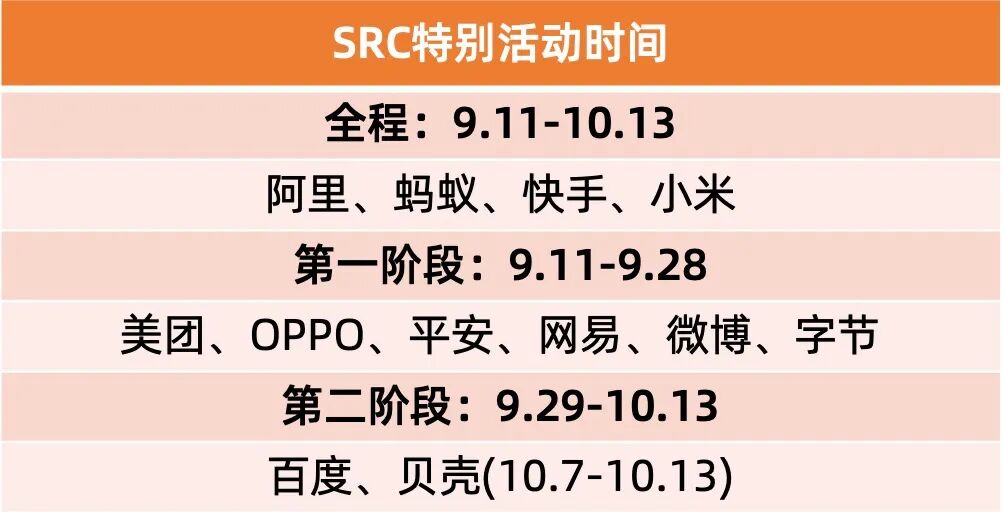 活动全程9.11-10.13期间,白帽同学向活动的12家SRC提交的活动范围内有效报告都会计入军衔奖励