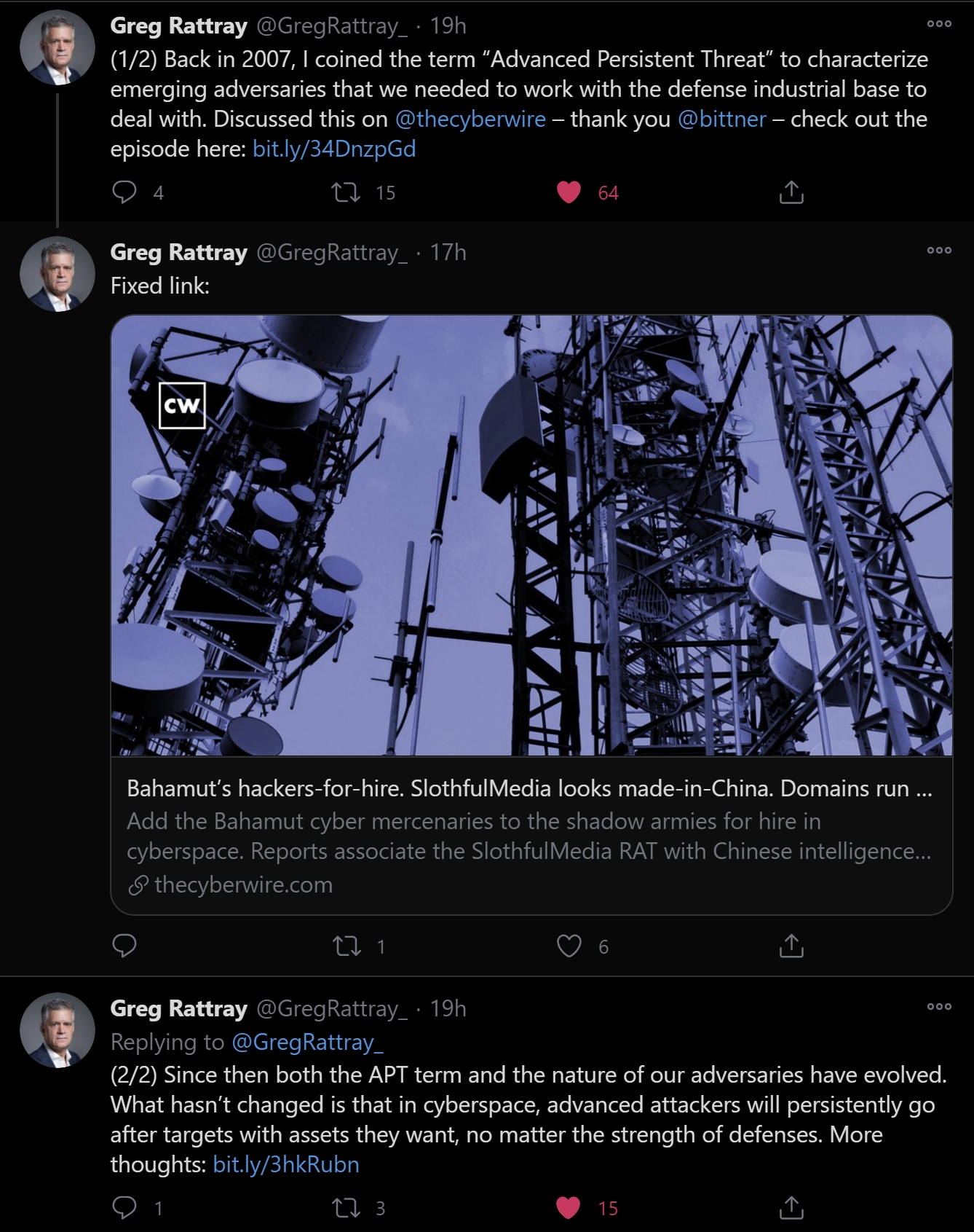 "Back in 2007, I coined the term “Advanced Persistent Threat” to characterize emerging adversaries that we needed to work with the defense industrial base to deal with... Since then both the APT term and the nature of our adversaries have evolved. What hasn’t changed is that in cyberspace, advanced attackers will persistently go after targets with assets they want, no matter the strength of defenses."