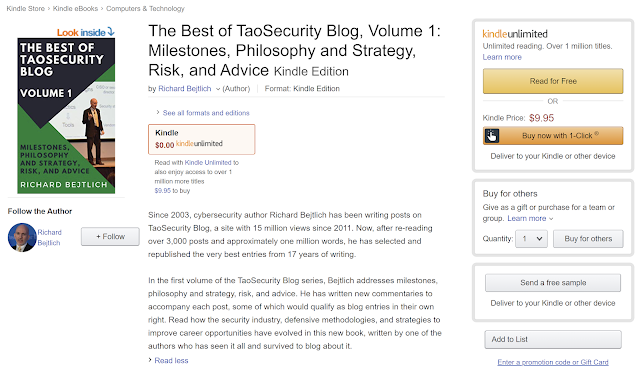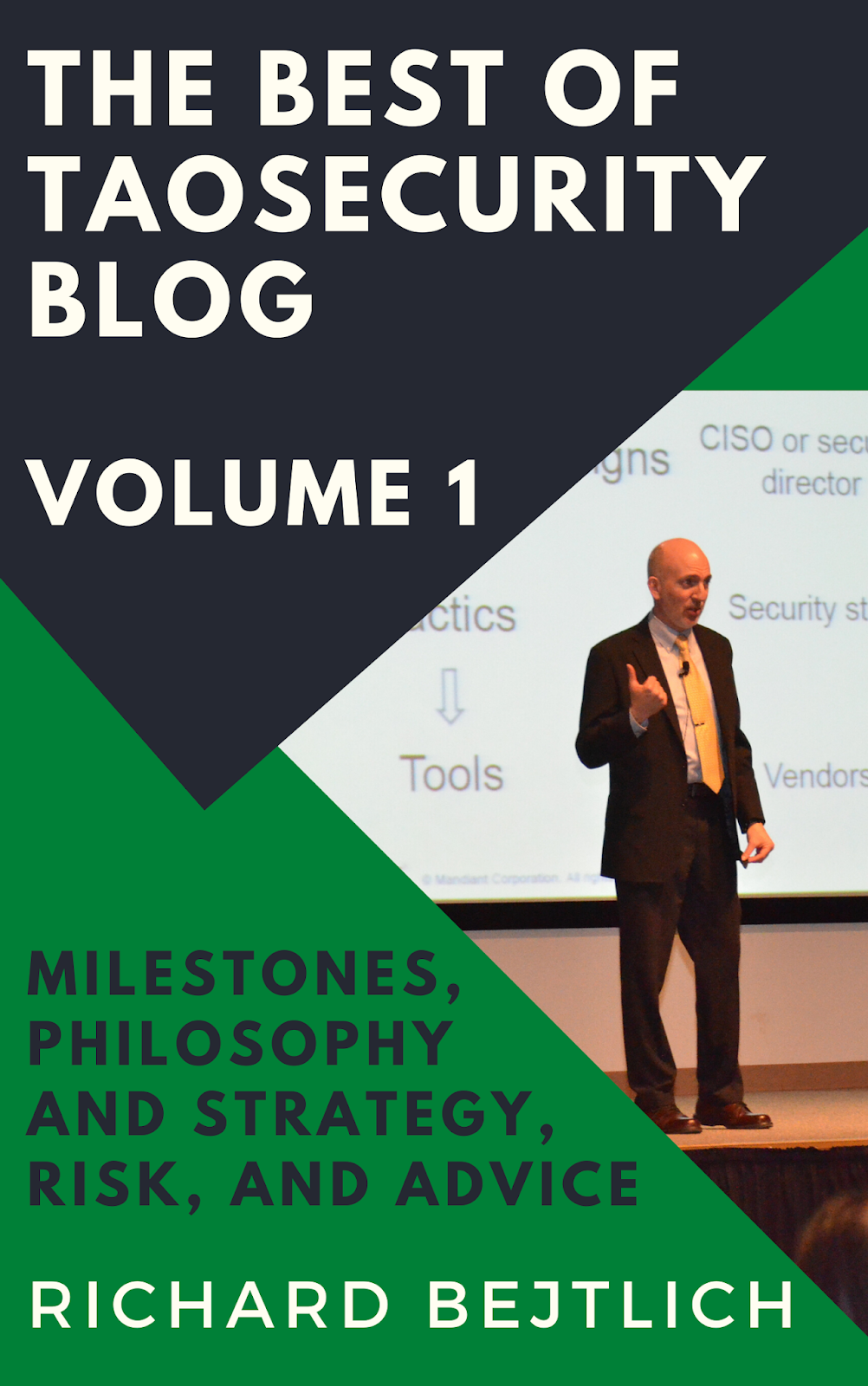 It's The Best of TaoSecurity Blog, Volume 1: Milestones, Philosophy and Strategy, Risk, and Advice. It's available now in the Kindle Store, and if you're a member of Kindle Unlimited, it's currently free. I may also publish a print version. If you're interested, please tell me on Twitter.