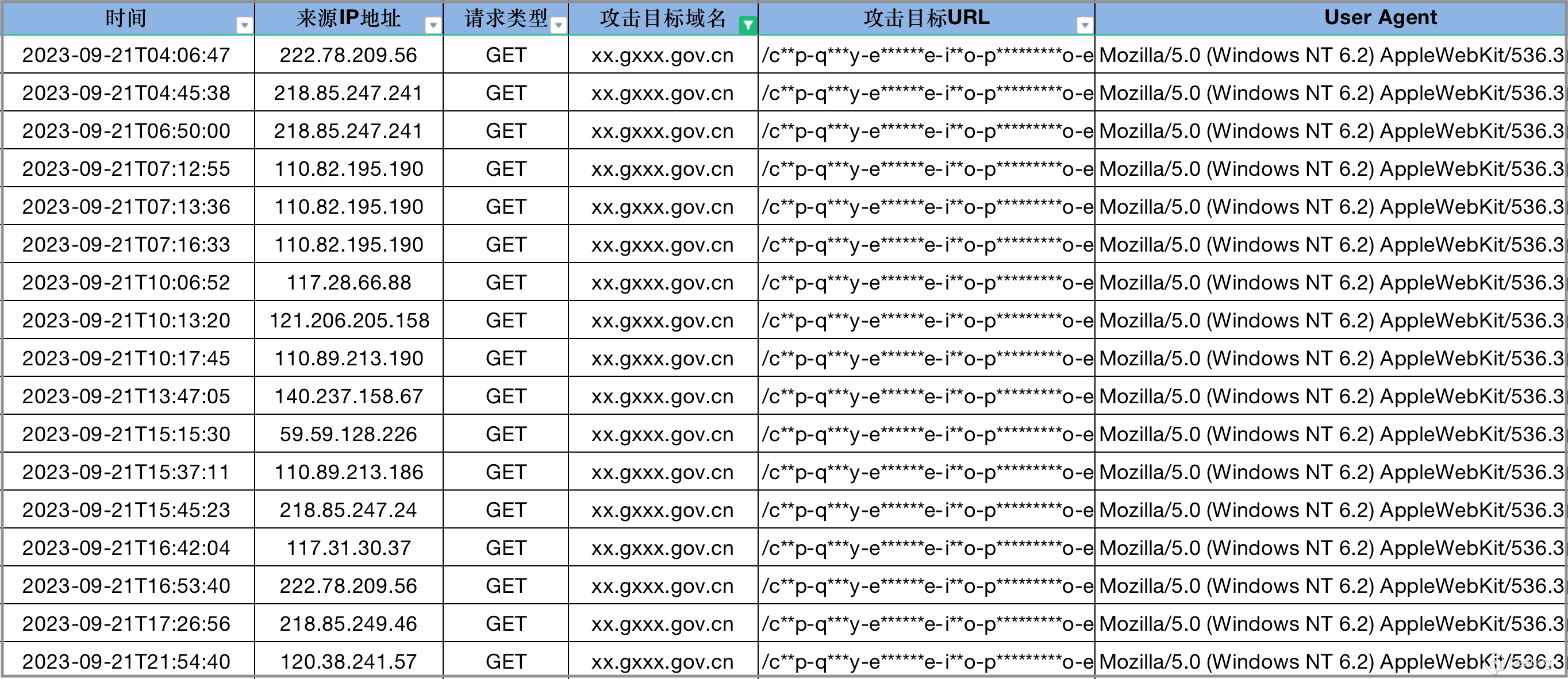 从攻击日志数据中,挑选出相同日期、相同目标域名、相同User Agent的攻击请求,如下图示例数据所示。虽然这些攻击请求的来源IP地址不一样,但是攻击目标URL是一样的,仅URL中携带的Payload参数有所不同,可以推断这些攻击请求的发起者为同一个组织。该推断,与"ssl_issuer"字段值为"xxh"的Softether VPN节点IP归属于同一个组织的推断,可以相互印证。