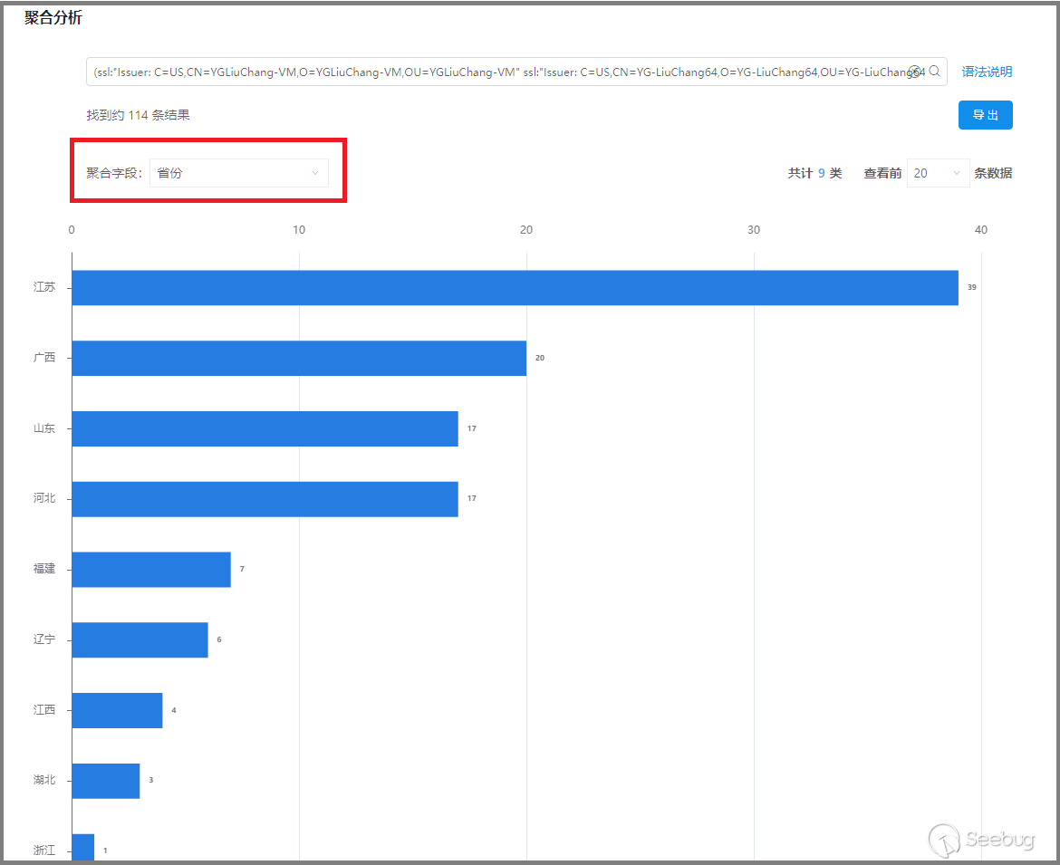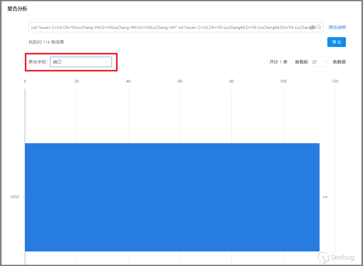 拓展发现114条网络资产,通过针对端口和国家/省份的分布统计,发现这些网络资产均位于中国大陆,均开放同一个端口:5555(rplay服务)。说明"LiuChang组织"网络活动区域在中国大陆,其专用证书不光使用在SoftEther VPN节点上,还使用在开启rplay服务的网络资产上。