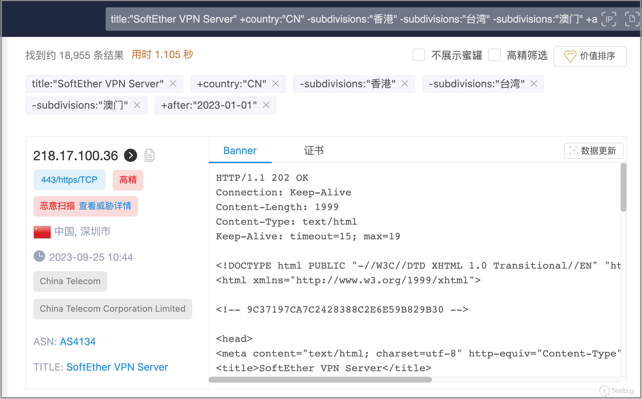 在ZoomEye网络空间搜索引擎平台中,使用如下的搜索语句,获取中国大陆区域2023年1月1日之后测绘获取的SoftEther VPN节点数据(搜索时间为2023年9月25日)。