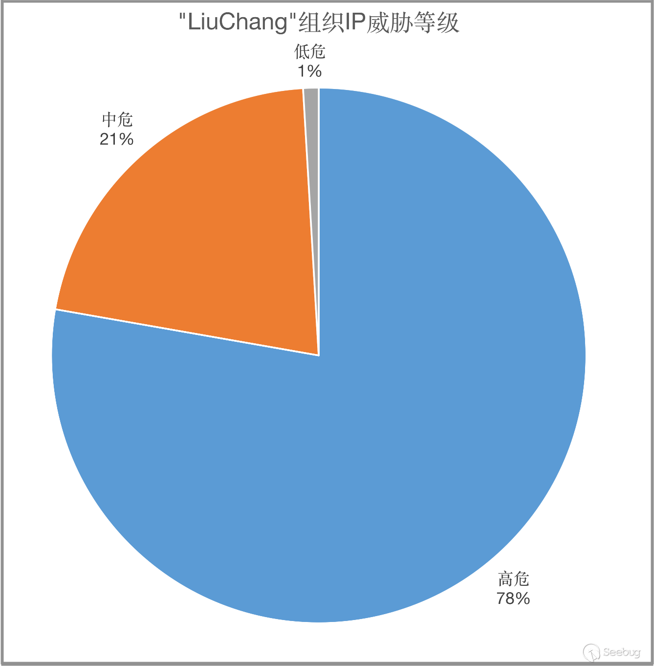 使用创宇安全智脑 ,查看"LiuChang组织" 643个IP地址的威胁等级情况,如下图所示。这643个IP地址全部被标记为威胁IP,其中高危IP占比高达78%。说明该组织大概率是一个实施网络攻击行为的组织。