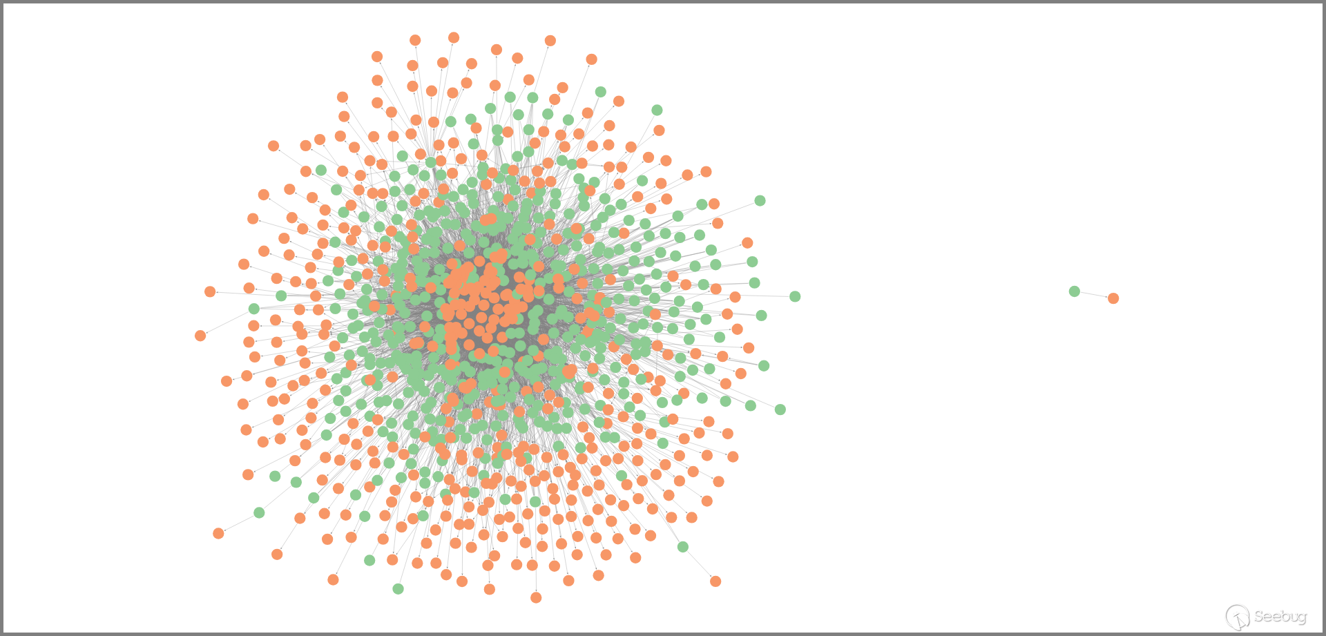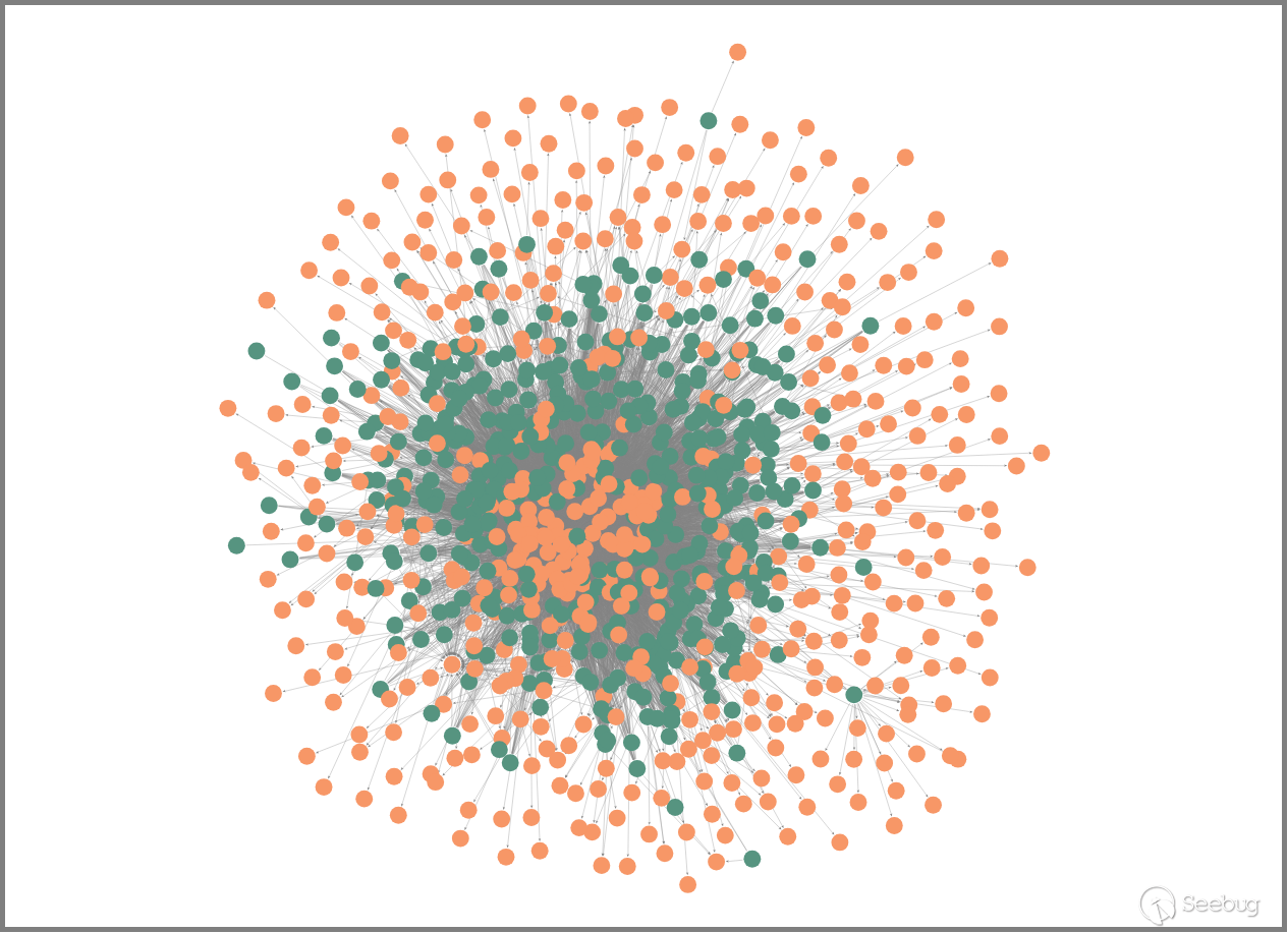 2023年9月1日至2023年9月25日之间,发现有598个IP地址攻击了524个站点,如下图所示。图中,绿色点表示一个IP地址,橙色点表示一个站点,两点之间的连线表示该IP地址攻击过该站点。