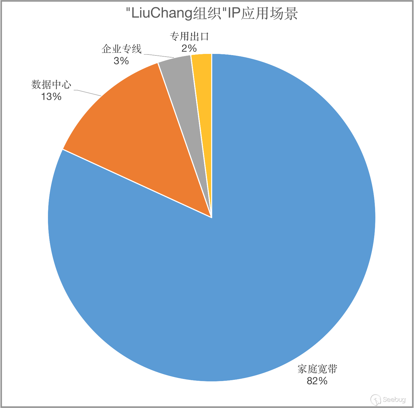 查看"LiuChang组织"的643个IP应用场景的情况,如下图所示。家庭宽带的IP数量最多,占比达到82%;其大多数为路由器和摄像头。