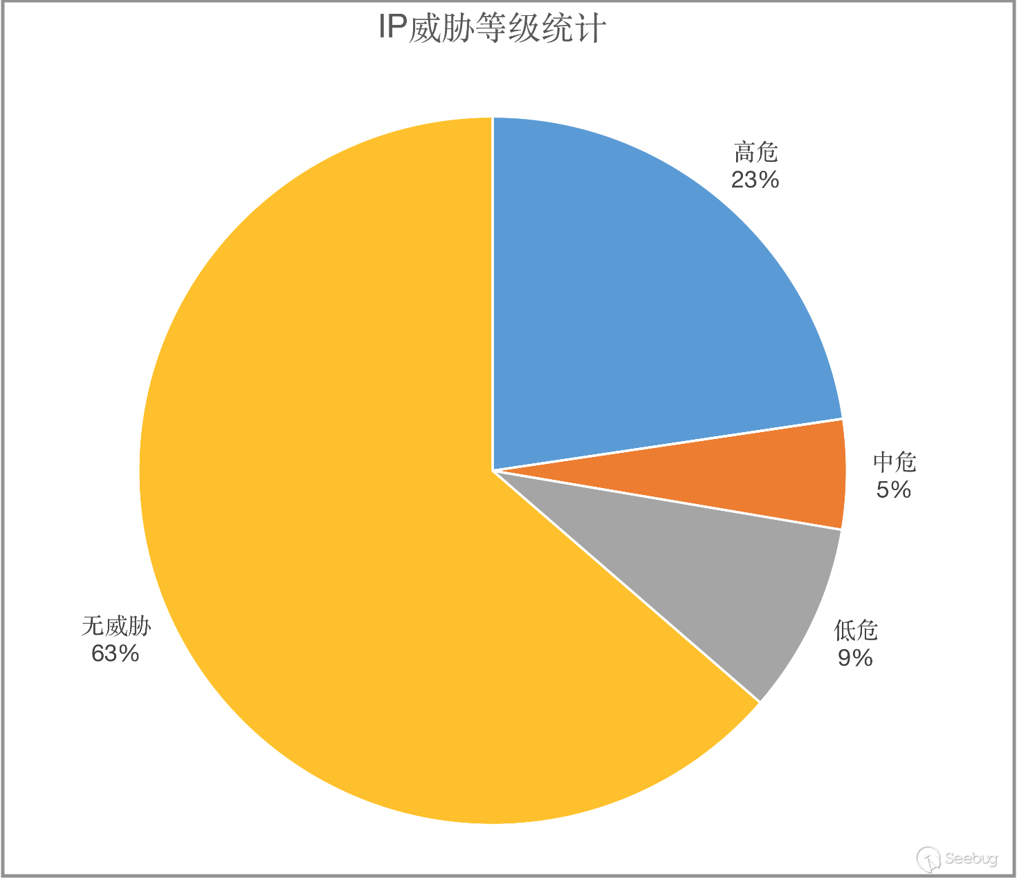 使用创宇安全智脑 ,查看这16582个SoftEther VPN节点IP地址的威胁等级情况,如下图所示。IP威胁等级越高,表示该IP地址近期发起网络攻击次数越多、攻击目标价值越高、攻击手法越高级。