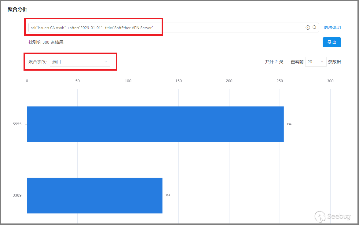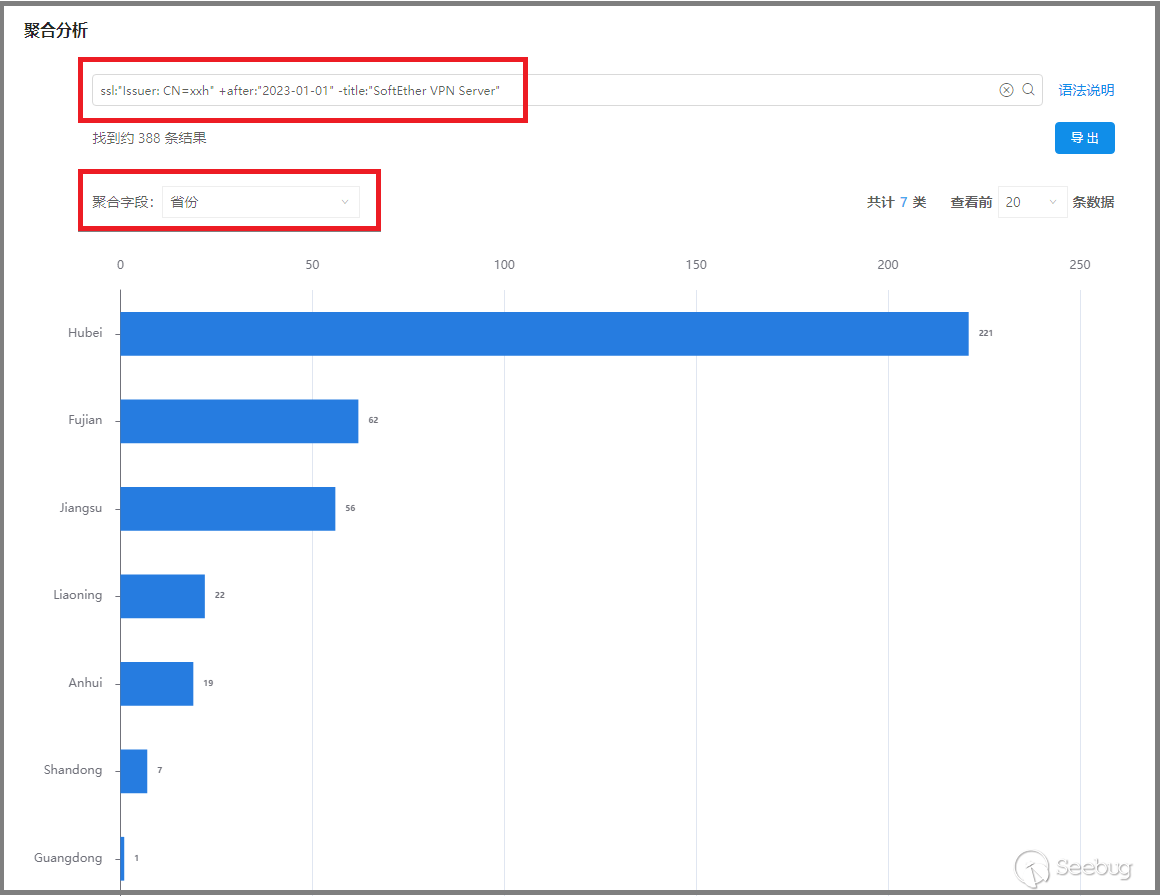 拓展发现388条网络资产,通过针对端口和国家/省份的分布统计,发现这些网络资产均位于中国大陆,包含2个开放端口:3389(远程桌面服务)、5555(rplay服务)。说明"xxh组织"网络活动区域在中国大陆,其专用证书不光使用在SoftEther VPN节点上,还使用在开启远程桌面服务和rplay服务的网络资产上。
