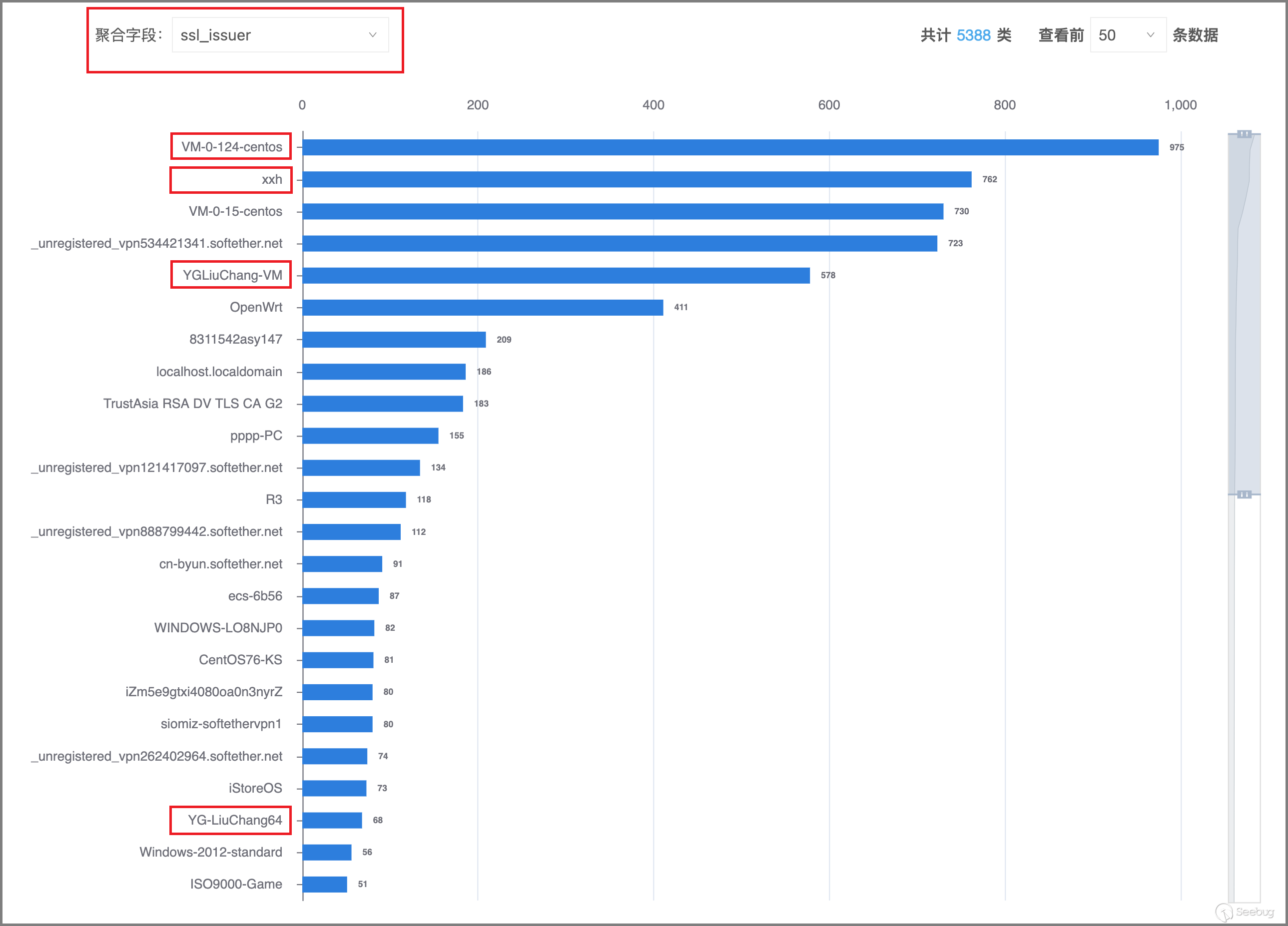 访问ZoomEye网络空间搜索引擎的"搜索聚合分析"页面,在搜索框中输入本章节开头的搜索语句,在聚合字段中选择"ssl_issuer",查看这些IP地址所使用SSL证书的颁发者信息,如下图所示。可以看出,这些SSL证书大多数为自签名证书(Softether VPN软件包含证书自签名功能)。
