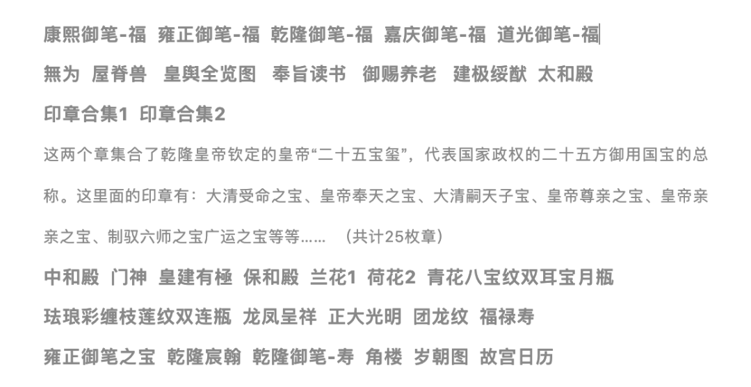 这两页章集合了乾隆皇帝钦定的皇帝“二十五宝玺”,代表国家政权的二十五方御用国宝的总称。