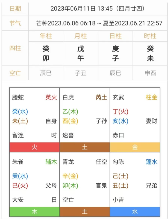 最后看朱雀辅木临自身落空亡,空亡不只有落空一个象,还有未定的象,结合其他六亲落宫看,这个空亡就不能取落空了,而是未定。朱雀又代表好事将近,又被代表顺利的蓬水生空亡宫又气盛。