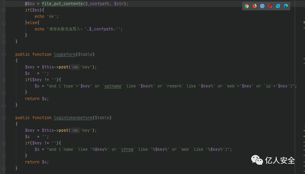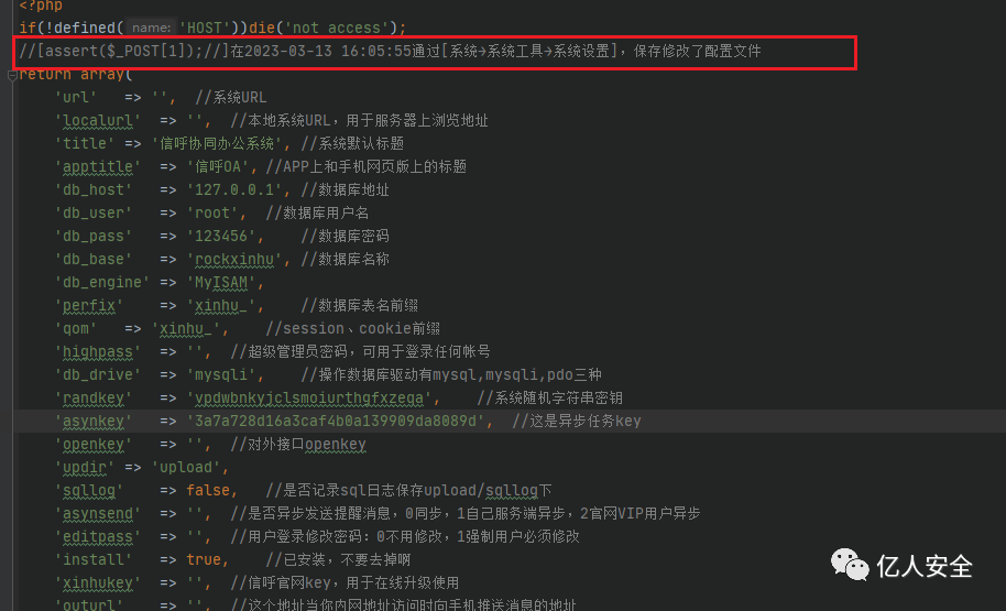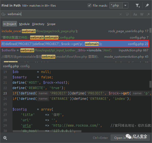 在通过file_put_contents()写入到配置文件中。由于该配置文件不能直接访问,所以要获取shell就要找到一处包含该文件并能通过路由访问到的文件。