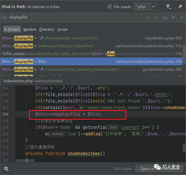 然后搜索 displayfile ,我们发现其中indexAction.php的 getshtmlAction 函数中的 displayfile 变量是通过 $file 进行赋值的。