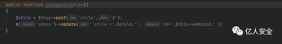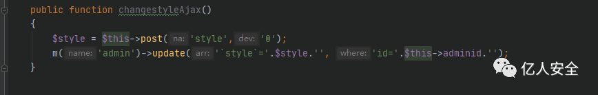 进入webmain/system/geren/gerenAction.php文件,发现函数 changestyleAjax() ,可以通过post传入style参数来实现update的SQL注入。