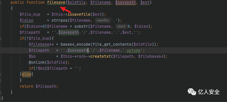 在查找关键函数的时候,我们发现可以解密 base64 文件的方法,关键可以通过控制id来还原 .uptemp 后缀为之前上传的后缀。从代码2的内容也可以看出,这里就是上面上传处理的一个反向操作,并且是通过 $fileid 参数来控制上传的文件。