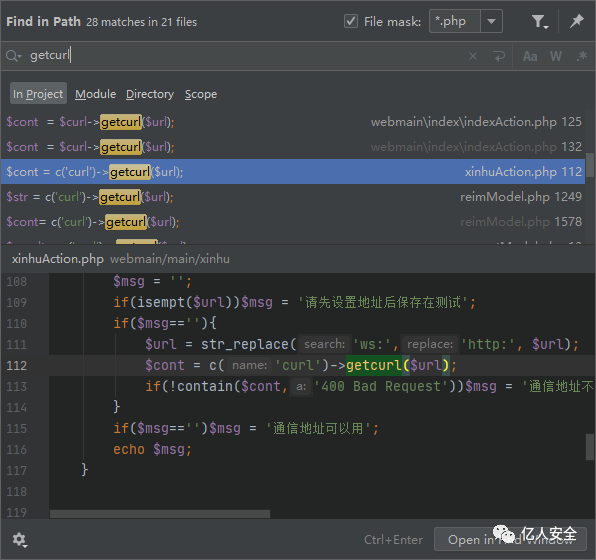 发现如下函数 getcurl() ,该函数中用到了函数curl_exec()