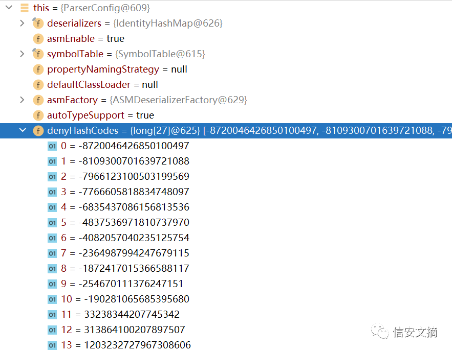 跟进该方法可以看到,有一个denyList数组存储着黑名单类,json字符串中的恶意类就在这其中