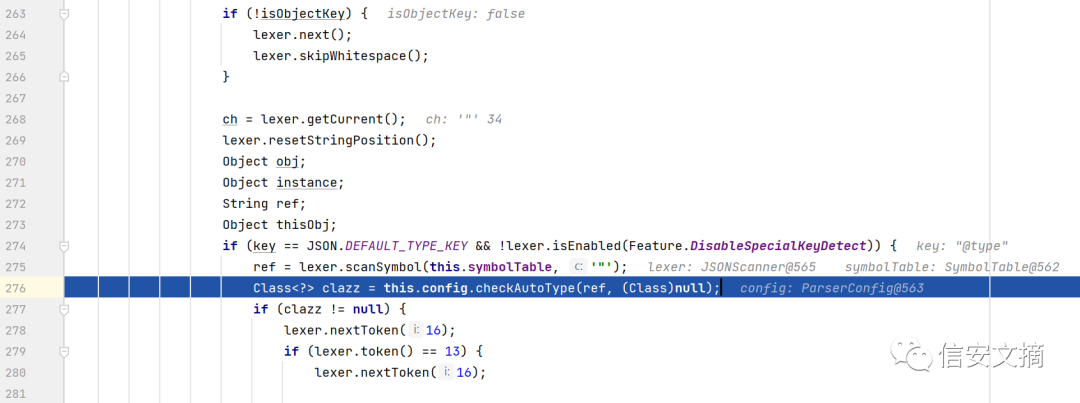 Class<?> clazz = this.config.checkAutoType(ref, (Class)null);对Lcom.sun.rowset.JdbcRowSetImpl;进行checkAutoType处理。