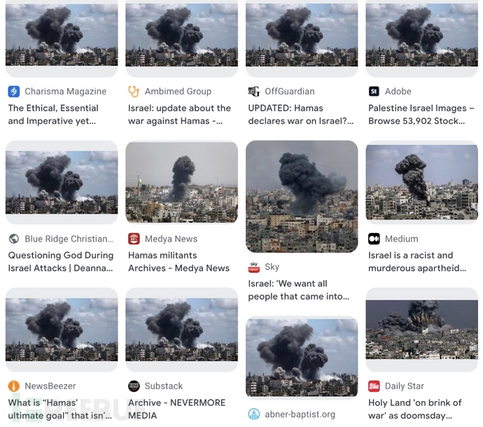 图2:一些媒体机构在报道巴以冲突新闻时已经使用图1左上角那张由AI生成的图片