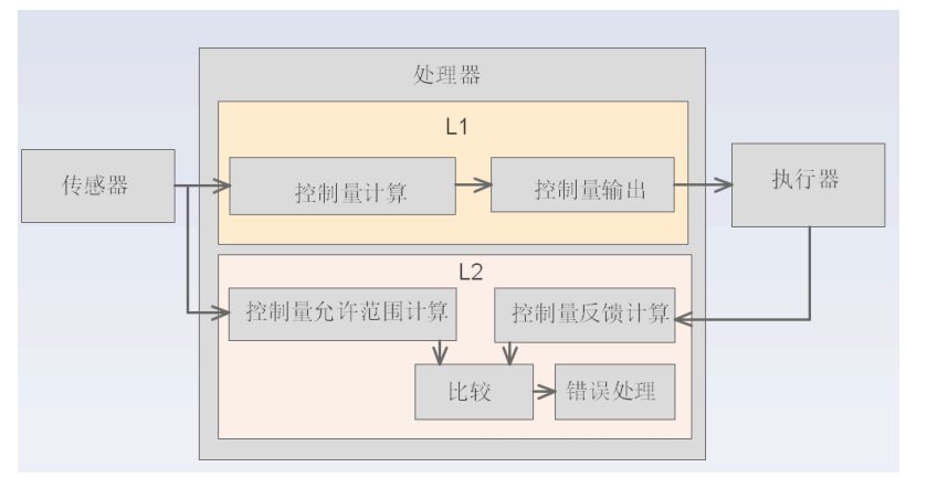 如上图 所示,Level2 在使用合理性校验方法判断 Level1 功能是否正常运行时,先根据传感器输入的信号,计算控制量允许输出的合理范围,再计算从执行器反馈的实际输出量,最后判定 Level1 的实际输出量是否在允许的合理范围,如果超出了合理的范围,则判定 Level1 功能异常,执行错误处理。