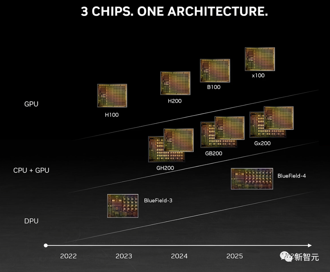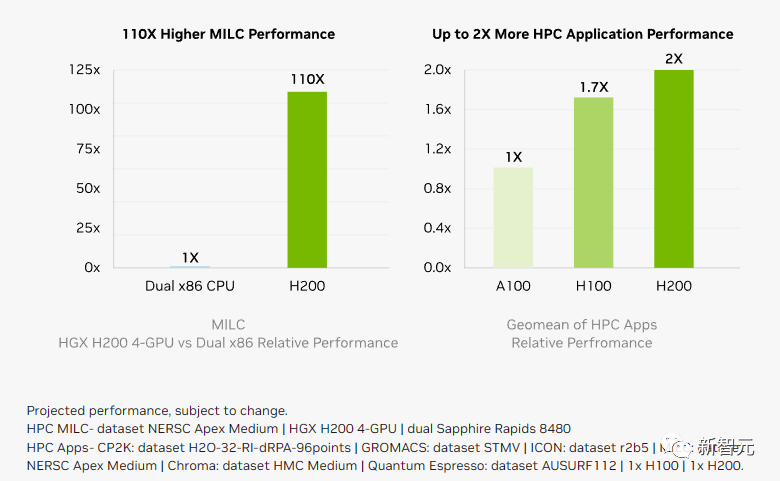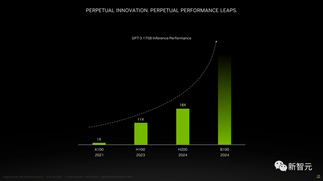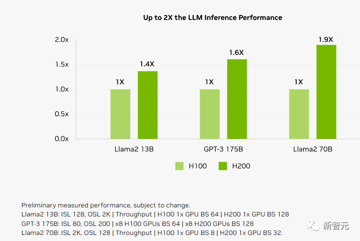 跟前代架构相比,Hopper 架构已经实现了前所未有的性能飞跃,而 H100 持续的升级,和 TensorRT-LLM 强大的开源库,都在不断提高性能标准。H200 的发布,让性能飞跃又升了一级,直接让 Llama2 70B 模型的推理速度比 H100 提高近一倍!H200 基于与 H100 相同的 Hopper 架构。这就意味着,除了新的显存功能外,H200 还具有与 H100 相同的功能,例如 Transformer Engine,它可以加速基于 Transformer 架构的 LLM 和其他深度学习模型。HGX H200 采用英伟达 NVLink 和 NVSwitch 高速互连技术,8 路 HGX H200 可提供超过 32 Petaflops 的 FP8 深度学习计算能力和 1.1TB 的超高显存带宽。当用 H200 代替 H100,与英伟达 Grace CPU 搭配使用时,就组成了性能更加强劲的 GH200 Grace Hopper 超级芯片——专为大型 HPC 和 AI 应用而设计的计算模块。下面我们就来具体看看,相较于 H100,H200 的性能提升到底体现在哪些地方。首先,H200 的性能提升最主要体现在大模型的推理性能表现上。如上所说,在处理 Llama 2 等大语言模型时,H200 的推理速度比 H100 提高了接近 1 倍。因为计算核心更新幅度不大,如果以训练 175B 大小的 GPT-3 为例,性能提升大概在 10% 左右。显存带宽对于高性能计算(HPC)应用程序至关重要,因为它可以实现更快的数据传输,减少复杂任务的处理瓶颈。对于模拟、科学研究和人工智能等显存密集型 HPC 应用,H200 更高的显存带宽可确保高效地访问和操作数据,与 CPU 相比,获得结果的时间最多可加快 110 倍。相较于 H100,H200 在处理高性能计算的应用程序上也有 20% 以上的提升。而对于用户来说非常重要的推理能耗,H200 相比 H100 直接腰斩。这样,H200 能大幅降低用户的使用成本,继续让用户「买的越多,省的越多」!上个月,外媒 SemiAnalysis 曾曝出一份英伟达未来几年的硬件路线图,包括万众瞩目的 H200、B100 和「X100」GPU。而英伟达官方,也公布了官方的产品路线图,将使用同一构架设计三款芯片,在明年和后年会继续推出 B100 和 X100。这次,英伟达更是在官方公告中宣布了全新的 H200 和 B100,将过去数据中心芯片两年一更新的速率直接翻倍。以推理 1750 亿参数的 GPT-3 为例,今年刚发布的 H100 是前代 A100 性能的 11 倍,明年即将上市的 H200 相对于 H100 则有超过 60% 的提升,而再之后的 B100,性能更是望不到头。至此,H100 也成为了目前在位最短的「旗舰级」GPU。如果说 H100 现在就是科技行业的「黄金」,那么英伟达又成功制造了「铂金」和「钻石」。H200 加持