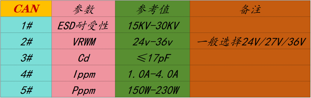为了确保稳健的系统级保护,满足汽车在各类环境中正常运行,CAN总线这种接口需要有非常强大的ESD保护解决方案,要确保系统不仅不会出现高压瞬变,而且要尽可能减少电容,以实现不受约束的信号传输,CAN和CAN FD推荐表4-1和表4-2参数。