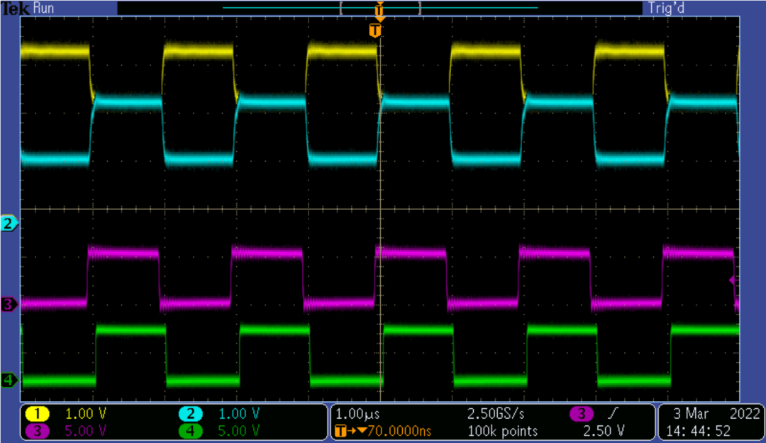 为测量信号完整性,两个电路板都采用5V电源,并在TXD引脚上施加500kHz (1Mbps) 的数字信号,来模拟HS CAN环境。将一个示波器连接到CANH(线路 1)、CANL(线路 2)、TXD(线路 3)和RXD(线路4),以观察结果。如图4-2和图 4-3中的结果所示,ESD2CAN24-Q1二极管根本不会劣化CANH和CANL信号。