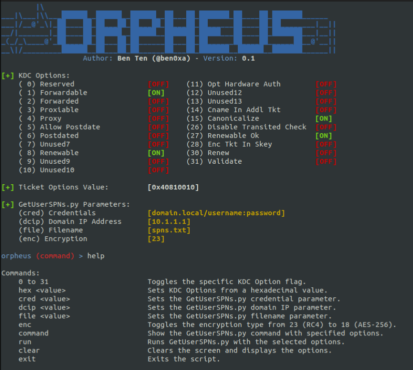 Orpheus 是 Impacket 的 GetUserSPNs.py 和 kerberosv5.py 的修改版本的包装器,它改变了 KDC 选项(票证选项)和 Kerberoasting 的加密类型。
