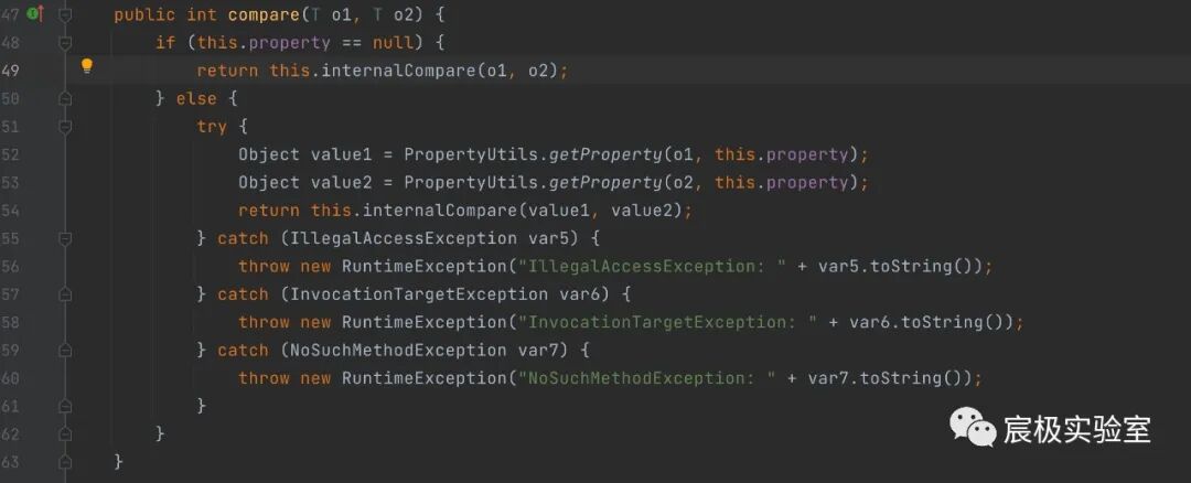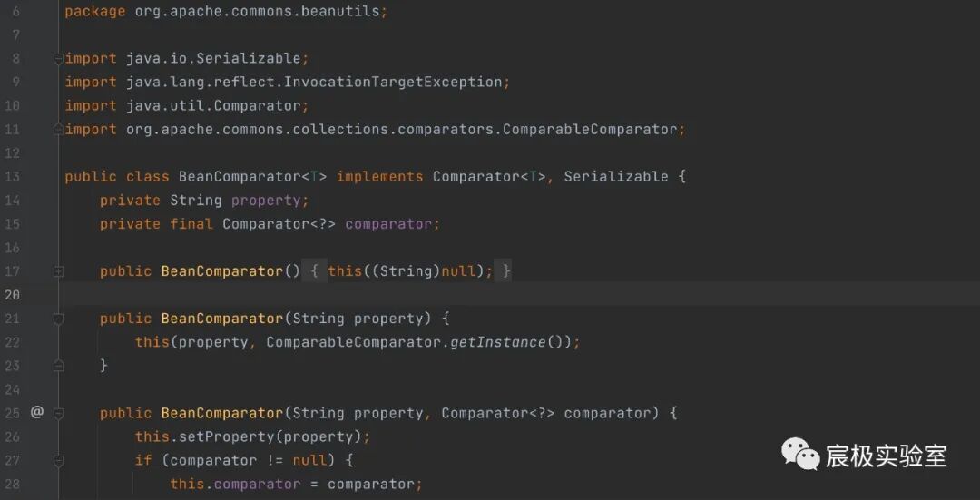 我们发现CB1利用链中传入PriorityQueue类对象,触发比较的对象从TransformingComparator类对象变成了BeanComparator类对象。那么我们来看一下BeanComparator类。