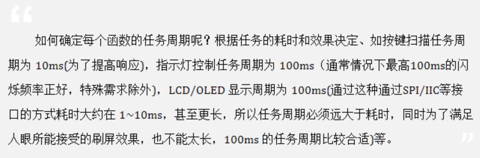 任务函数无需时刻执行,存在间隔时间(比如按键,一般情况下,都需要软件防抖,初学者的做法通常是延时10ms左右再去判断,但10ms极大浪费了CPU的资源,在这段时间内CPU完全可以处理很多其他事情)