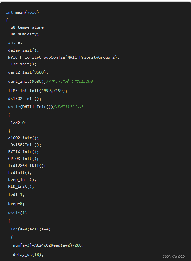 这是初学者们常用的程序框架设计方案,不用考虑太多东西,代码简单,或者对系统的整体实时性和并发性要求不高;初始化后通过while(1){}或for(;;){}循环不断调用自己编写完成的函数,也基本不考虑每个函数执行所需要的时间,大部分情况下函数中或多或少都存在毫秒级别的延时等待。