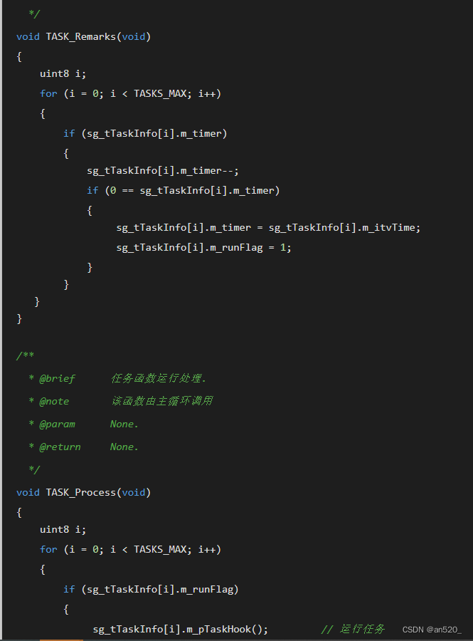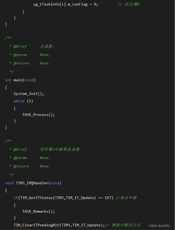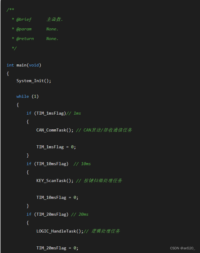 该设计方案需要使用一个定时器,一般情况下定时1ms即可(定时时间可随意定,但中断过于频繁效率就低,中断太长,实时性差),因此需要考虑到每个任务函数的执行时间,建议不能超过1ms(能通过程序优化缩短执行时间则最好优化,如果不能优化的,则必须保证该任务的执行周期必须远大于任务所执行的耗时时间),同时要求主循环或任务函数中不能存在毫秒级别的延时。