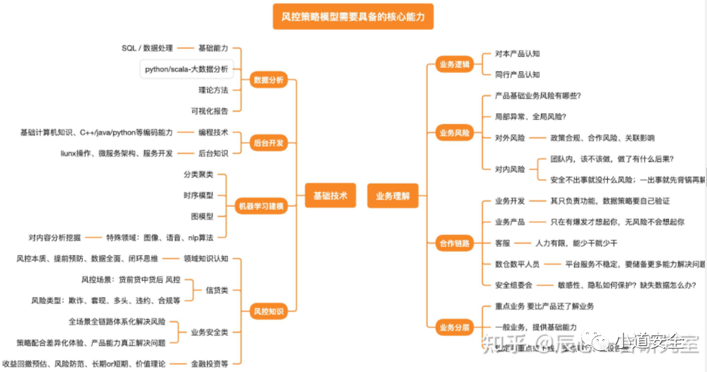 技术方案:信贷准入更重模型、重分析、轻策略;基础技术知识点有,SQL、Python、大数据、建模;登陆场景风控,重策略、重实时、轻模型;基础技术知识点为,C++/Java、Python、SQL;