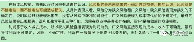 风险指的是未来结果的不确定性或损失,换句话说,风险就是不确定性,而不确定性可能造成损失。从具体表现来看,风险分为狭义风险和广义风险:狭义风险表现为损失的不确定性,说明风险只能表现出损失,没有从风险中获利的可能性;广义风险表现为成本或代价的不确定性,最终的风险结果会出现损失、盈利和盈亏平衡三种可能。