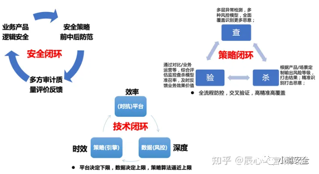 首先产品安全本身的闭环:业务产品要负责整个产品的逻辑安全;安全策略重点做前中后的风险防范;最终还需要多方对安全进行审计、质量评价反馈,及时调整策略逻辑。