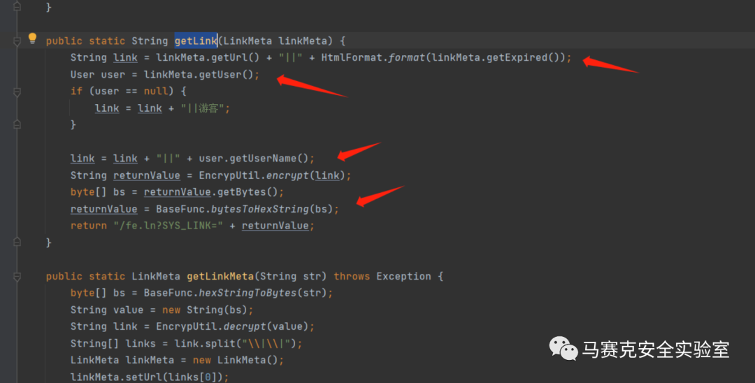 继续分析,向上翻阅发现getLink()方法,该方法可获取LinkMeta值,是我们需要的值,分析该方法所需三部分构造:geturl()||getExpired()||getUser(),然后进行encrypt()方法加密,在进行bytesToHexString()方法十六进制加密,最后输出"/fe.ln?SYS_LINK=" + returnValue;
