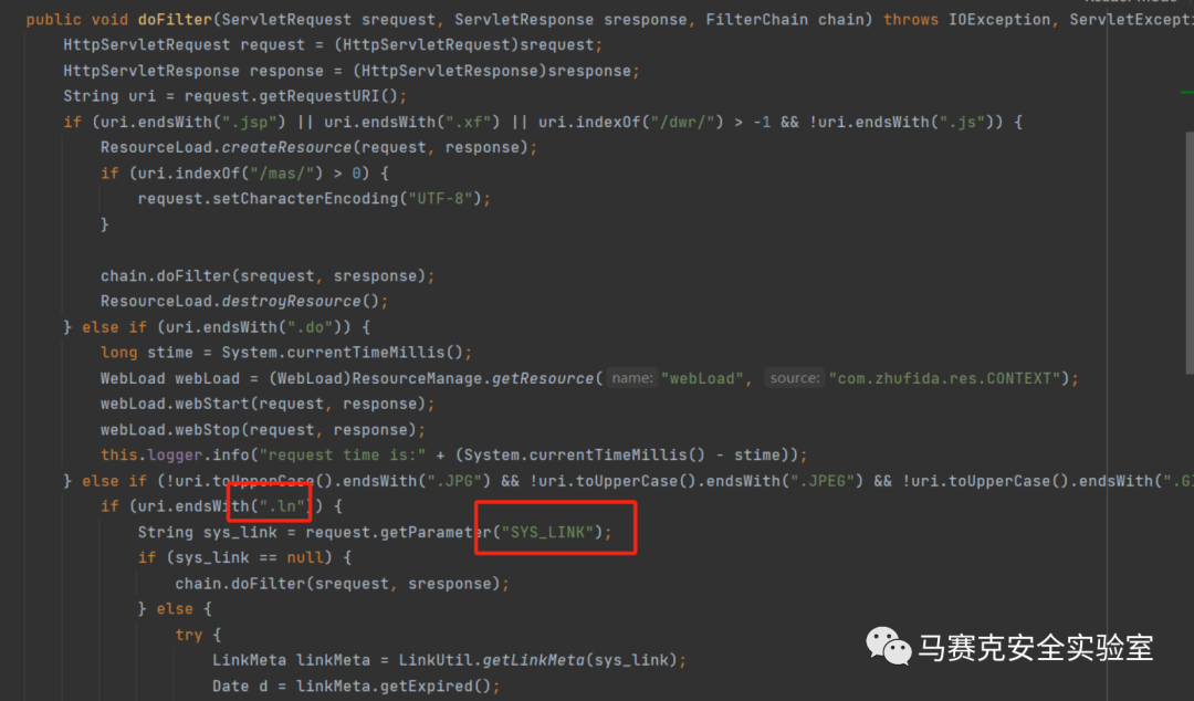 定位到ControllerFilter类用来做控制过滤器,发现uri中包含.ln,构造SYS_LINK(LinkMeta)的值来绕过登陆