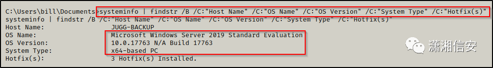 systeminfo | findstr /B /C:"Host Name" /C:"OS Name" /C:"OS Version" /C:"System Type" /C:"Hotfix(s)"