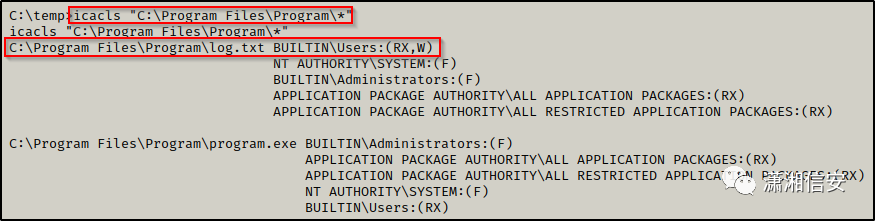 通过在末尾添加通配符,我们能够检查对 Program 文件夹的所有文件/子文件夹的权限。幸运的是,我们对日志文件有写权限!