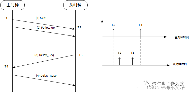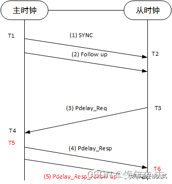 (1)Sync,主时钟发出 sync 报文,并记录下 sync 报文离开主时钟的精确发送时间 T1;