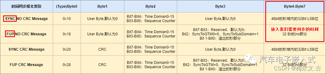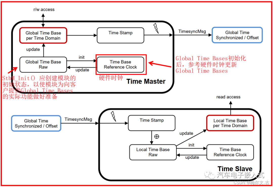Master 先基于本地时钟生成一个Global Time Base,根据这个Global Time Base会更新Master 的所有时间控制单元,之后打出时间戳,通过Message发出去